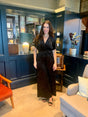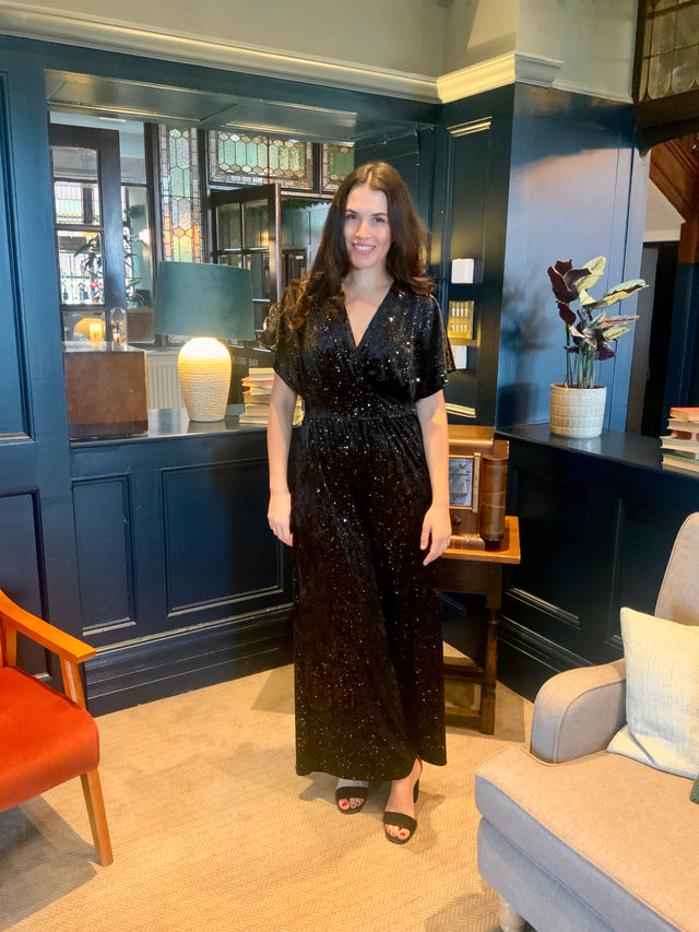 Sparkle this season in this wide-leg jumpsuit in starry night velvet with multi-glitter. This jumpsuit features a plunge neckline, gathered bust, flutter sleeve, back keyhole opening. Pair with your favourite flat or heel and add your favourite jewellery for that extra twinkle.