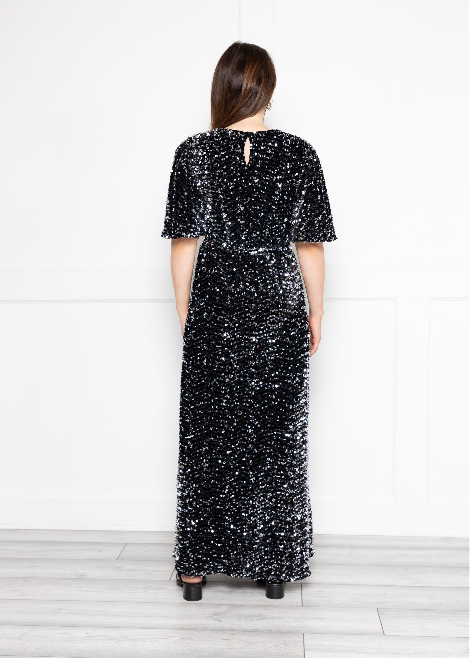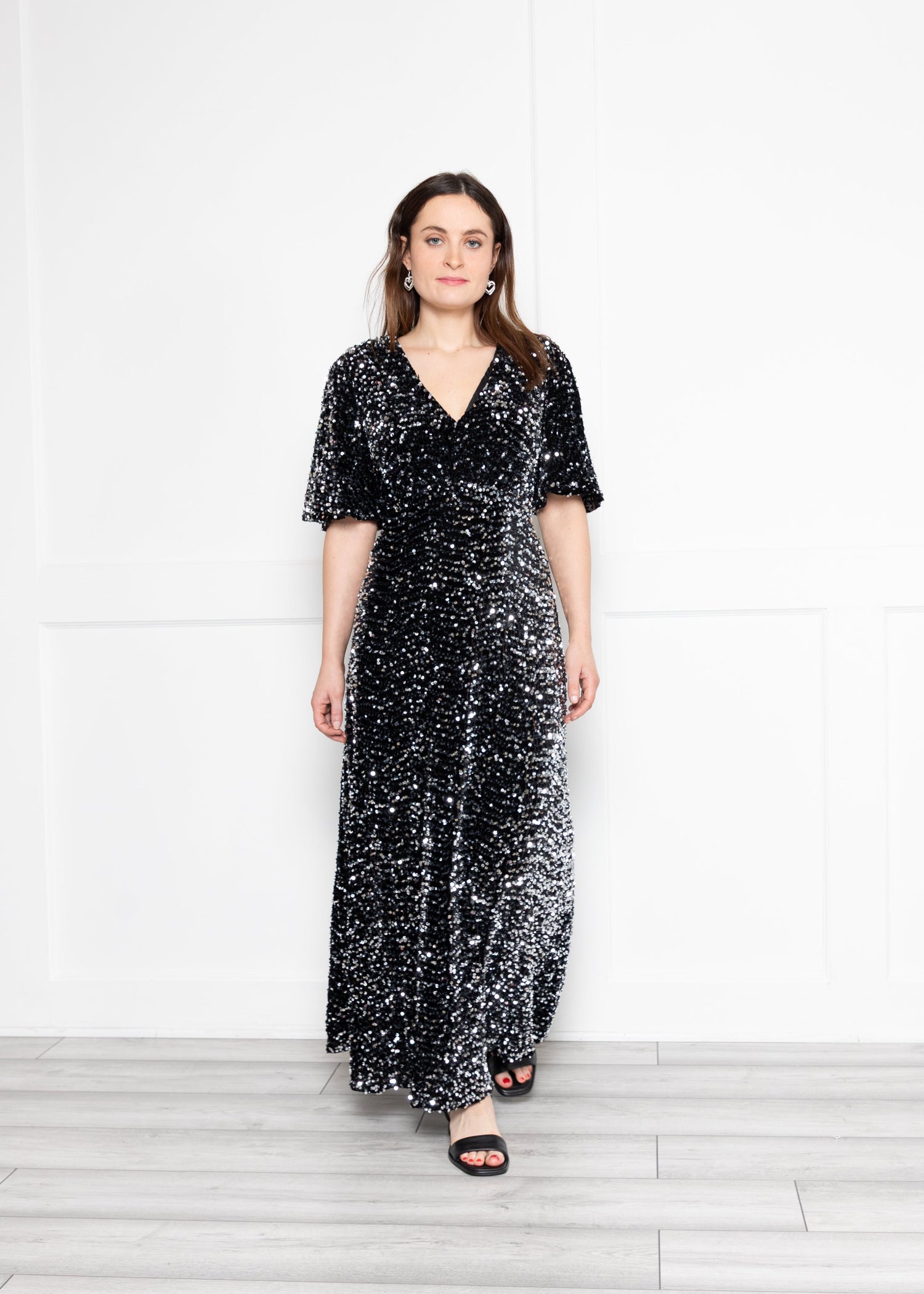 Shine in any room wearing this Grace flutter sleeve maxi dress in black and silver disco ball sequin velvet. This dress features a v neck bustline, flutter sleeve, elasticated back, flowing maxi length skirt, back keyhole opening and pockets, for your ease. Style it with your favourite pair of heels for a chic christmas look.