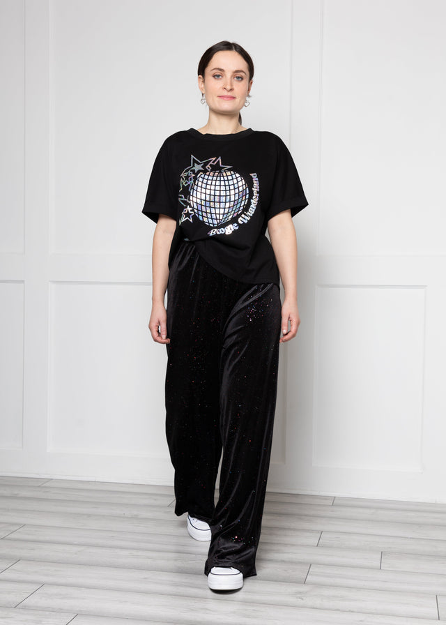 Party at every occasion in our Phoebe black velvet with multi glitter wide leg trouser. This trouser features side pockets, flowing wide leg and contrast metallic stripe elastic. Pair with our Twisted T for a relaxed night out.