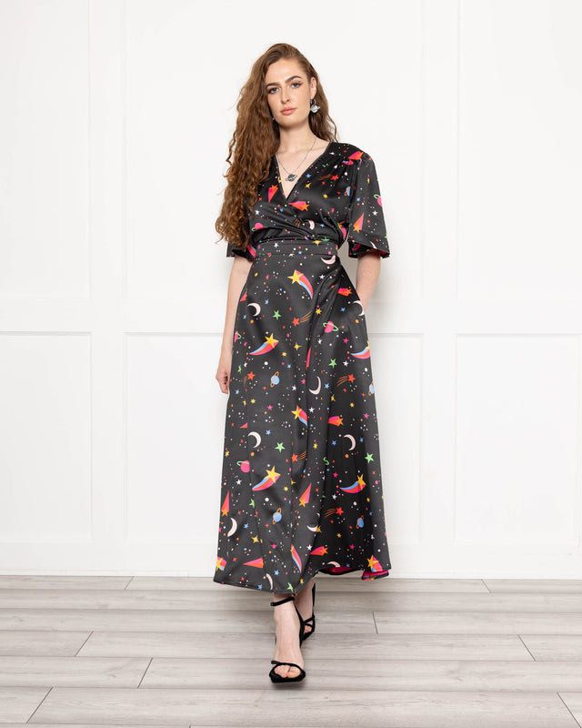 Be distinctive this season in this stunning Joni wrap bust maxi dress in shooting star galaxy print. This dress features a wrap bust, flutter sleeve and elasticated back with back tie waist perfect for any size. Style our Disco Planets necklace and earrings to sparkle in any room.