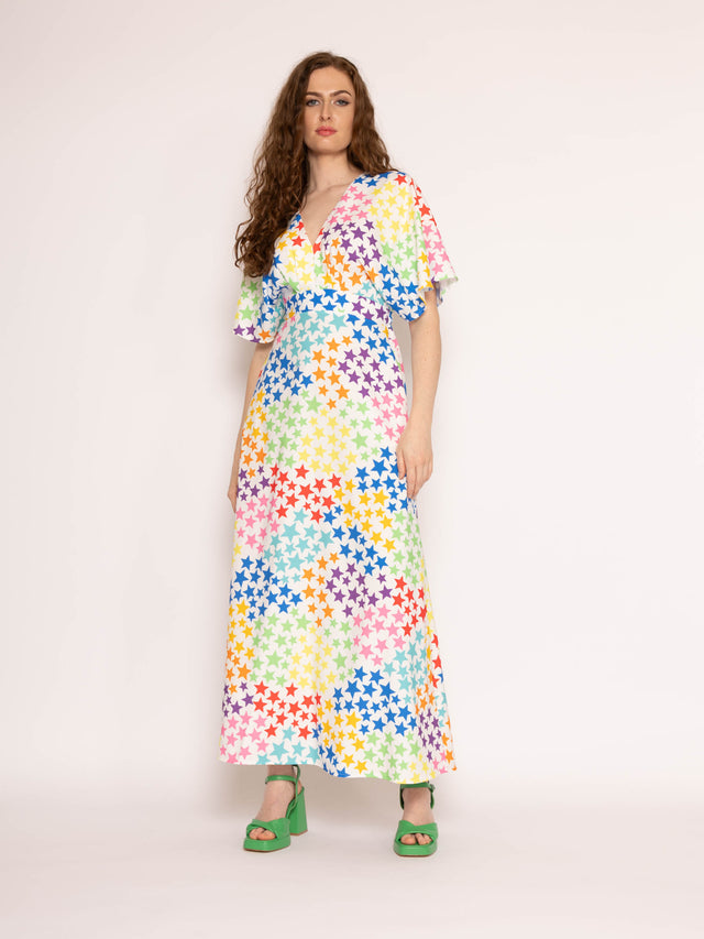 Shine in this bright multicolour maxi dress in flying star print. This dress features a v-neckline with a flowing maxi length skirt, kimono sleeves, elasticated back, back keyhole opening, back waist tie and pockets, for your ease. Pair it with your favourite heels for a stylish look.