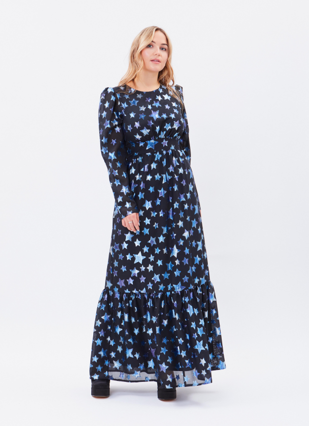 Shine in any room in this Rock Me frill maxi dress in blue star foil chiffon. This dress features a gathered bust, puff long sleeve, frill hem, back keyhole opening, back waist ties, lining and elasticated back for your comfort. Style with your favourite pair of boots or heels to stand out from the crowd.