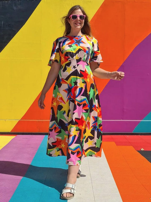 Shine in this 'Ziggy' flutter sleeve day maxi dress. This dress features a gathered bust, flutter sleeve, elasticated back, flowing maxi length skirt, back keyhole opening, back waist tie and pockets, for your favourite pair of low heels or trainers for that day to evening look.